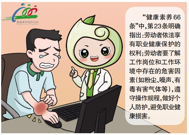 国家卫健委发布的新版“健康素养66条”中,第23条明确指出:劳动者依法享有职业健康保护的权利;劳动者要了解工作岗位和工作环境中存在的危害因素(如粉尘、噪声、有毒有害气体等),遵守操作规程,做好个人防护,避免职业健康损害。